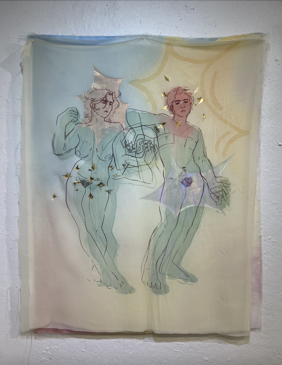 screen printing, heat press dyes, and foiling on 3 separate layers of sheer fabrics