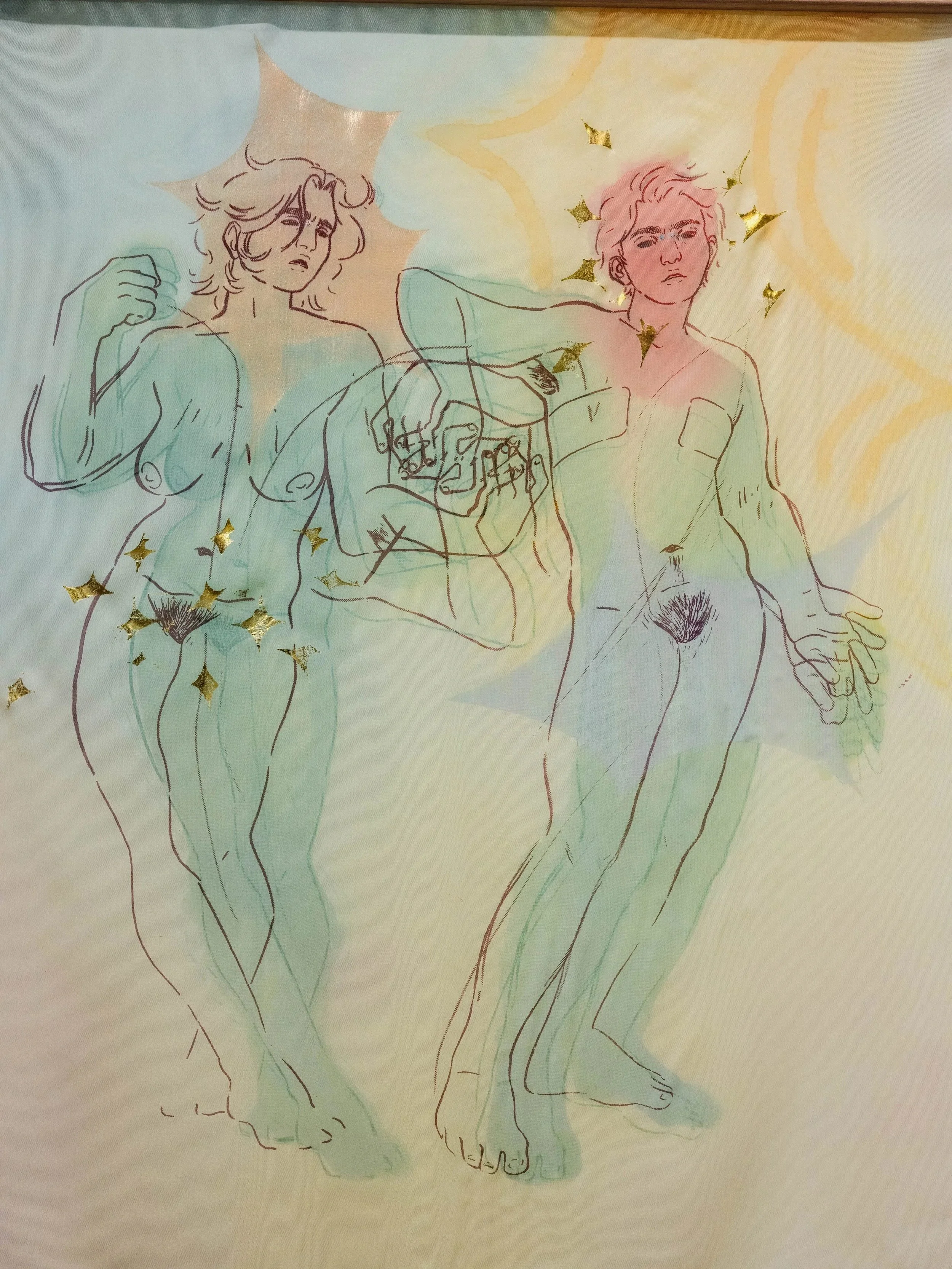screen printing, heat press dyes, and foiling on 3 separate layers of sheer fabrics